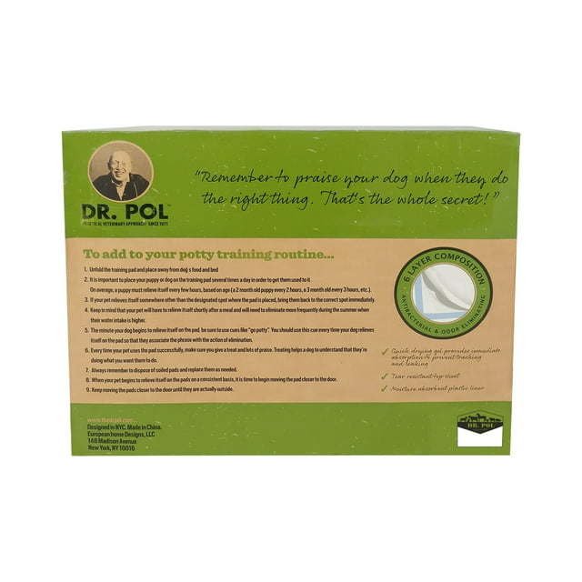 Dr. Pol for Dogs Puppy Training Pads are a leak-proof solution to training your pet. The ingredients neutralizes odor while the pheromone attractant helps puppies navigate what to do when it's time to go. With a quilted pattern to lock in urine and 5 layers of leak-proof protection, the improved super absorbing gel technology solution makes Dr. Pol puppy pads the go-to product for dog training. This pack of puppy pads for potty training comes with 100 wee wee pads, bringing pet parents puppy pads in bulk. Directions: Place pad on floor, quilted side up. Guide pet to pad to sniff. Reward when pet successfully uses pad. Gradually move pad to door. WARNINGS: Keep out of reach of children and animals. Discard if damaged, loose, or exposed. Do not let pets ingest. Remember to praise your dog when they do the right thing. That's the whole secret! Dog puppy pads are important pet supplies for dogs at home. Pee pads for dogs like these puppy pee pads are important dog supplies from Dr. Pol. Training pads for dogs like these dog pee pads are potty pads that can help with potty training for dogs. A dog pad like these dog potty pads are great dog stuff for the home. Pet training pads come in large puppy pads sizes, pet pads for dogs extra large, small dog pee pads, xl puppy pads, pads for dogs, puppy pads xlarge jumbo, and helpful for dog potty training. YOUR SATISFACTION IS OUR PRIORITY: For any questions or feedback about this product, please reach out to European Home Designs directly. Email customer service at info@bow-wowpet.com
