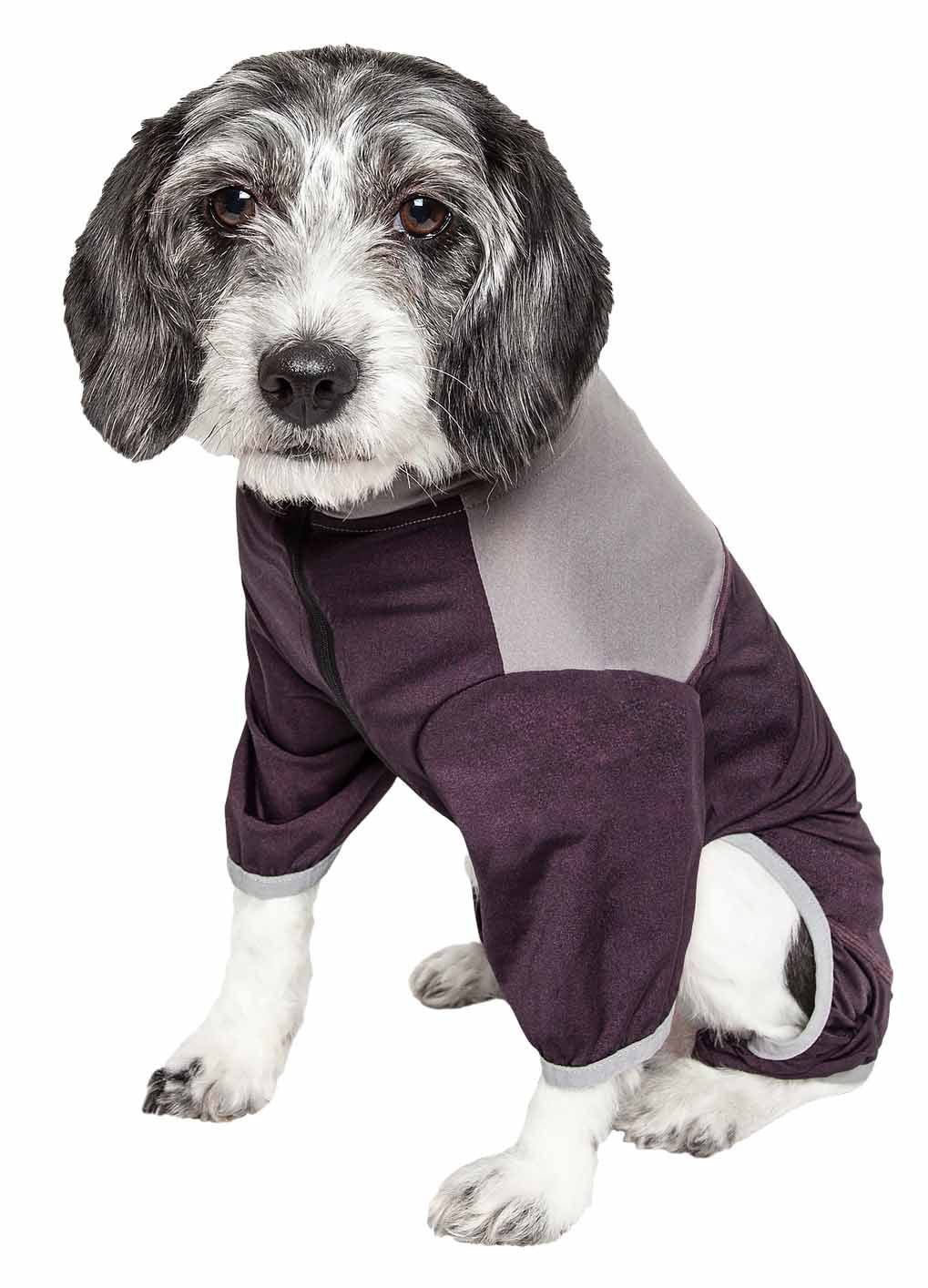 The Pet Life ACTIVE 'Embarker' Dual-Toned Full Bodied Tracksuit is Next-Generation performance unleashed. Features a specially formulated Ultra-Lightweight Micro-knit system that maintains body temperature and features 4-way Stretch technology that moves better in every direction for premium comfort and mobility with strategic ventilation points for Breathability. Features a tapered and streamlined fit that's also expandable with stretch-banded lining that extends additional room for growth. This fabric features Quick-Drying properties that repels perspiration and dries really fast while offering Anti-Odor technology that assists with odor causing microbes. Offers UV Protection against the suns harmful rays and fitted to help assist in containment or collection of shedded hairs. Design features Dual Reinforced stitching at every seam for Durability and a zipper for convenient on and off access with a zippered track protector preventing hairs from entrapment and a leash slit for easy on and off access. Features a sporty stretch collar fashion collar and Reflective Taping for added night visibility. Machine Washable. This style is part of our Pet Life Activewear Collection. Available in Multiple Sizes and Colors.